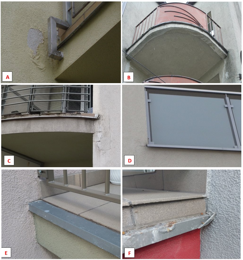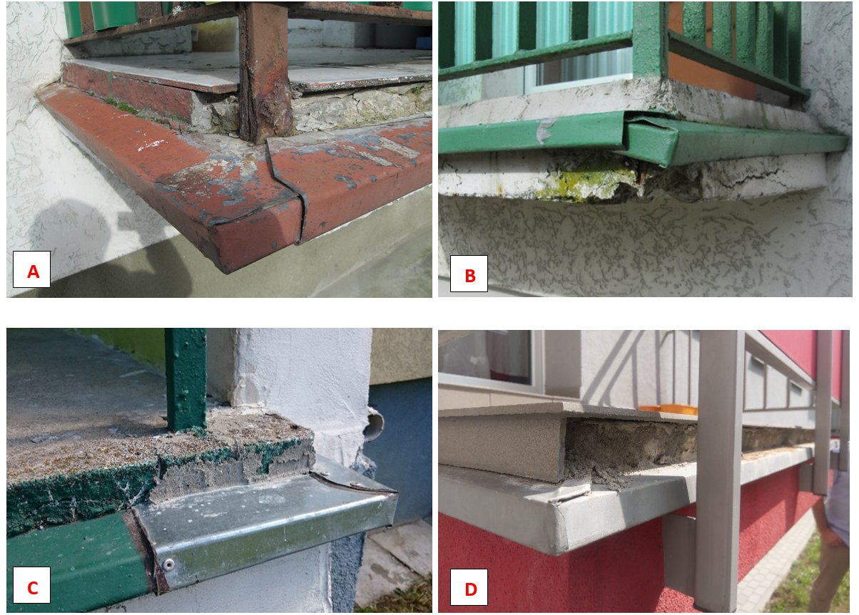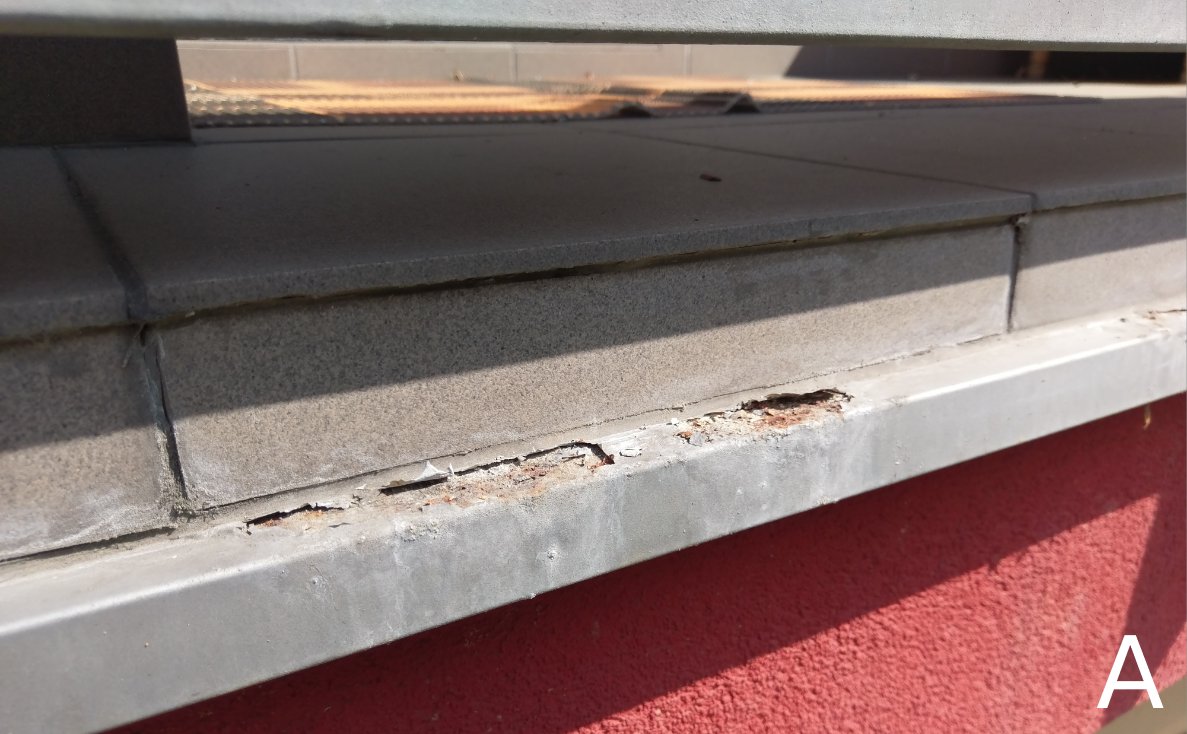 (B) korozja opierzenia balkonowego z blachy ocynkowanej tuż przy krawędzi wylewki cementowej