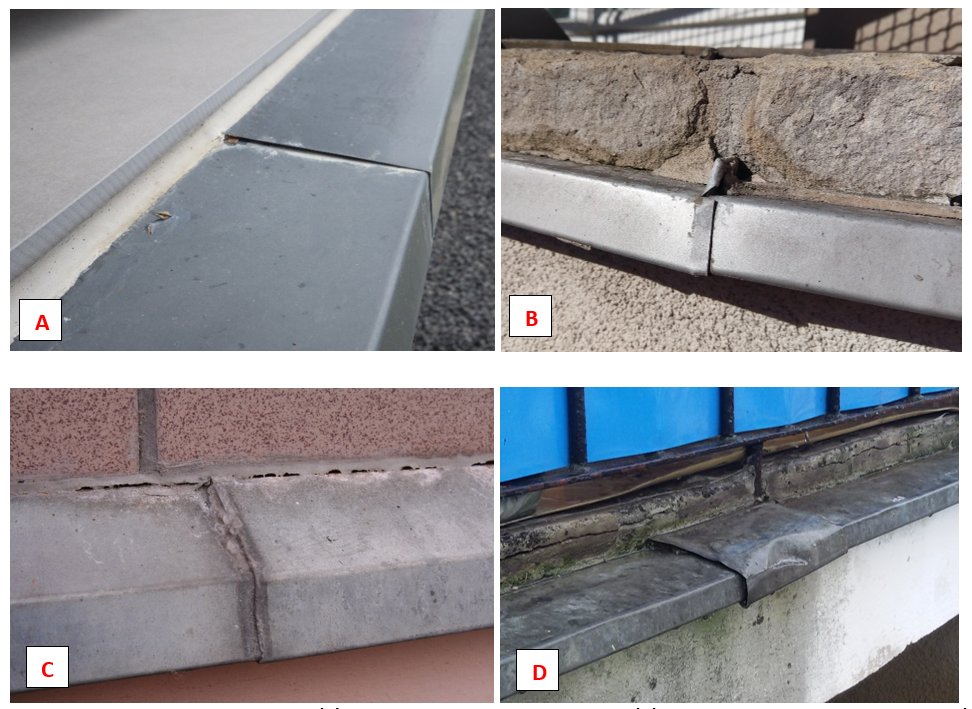 Obróbki blacharskie kształtuje się na giętarce zwykle z arkuszy o wymiarach 100x200 cm. Motywowane jest to ograniczeniami przestrzeni transportowej samych arkuszy jak i wielkością samego urządzenia do gięcia. Przy wymiarach balkonu większych niż 200 cm zawsze konieczne będzie połączenie co najmniej dwóch okapników. Najczęstszym sposobem jest montaż na zakładkę (Fot. 8A). Brak uszczelnienia oraz prawidłowego zamocowania powoduje jednak podwijanie się blachy ku górze w wyniku naprężeń termicznych, co jest częstą przyczyną przecieków. Łączenie dekarskie blach na tzw. „rąbek stojący lub leżący” (Fot. 8B) jest trudne do uszczelnienia zaprawą uszczelniającą i taśmą z uwagi na tworzące się duże zgrubienia, dlatego spotykane jest głównie na balkonach z papą i warstwą dociskową. Lutowanie jako technika łączenia jest rzadko stosowane, wymaga wytrawiania kwasem solnym cynku, lut usztywnia łączone elementy, co z kolei tworzy naprężania i fałdowanie się blachy (Fot. 8C). Zakładki z dodatkowego pasa blachy (Fot. 8D) są trudne do wykonania i rzadko spotykane, jednak i tu brak uszczelnienia oraz podatność blachy na odkształcania są powodem przecieków.