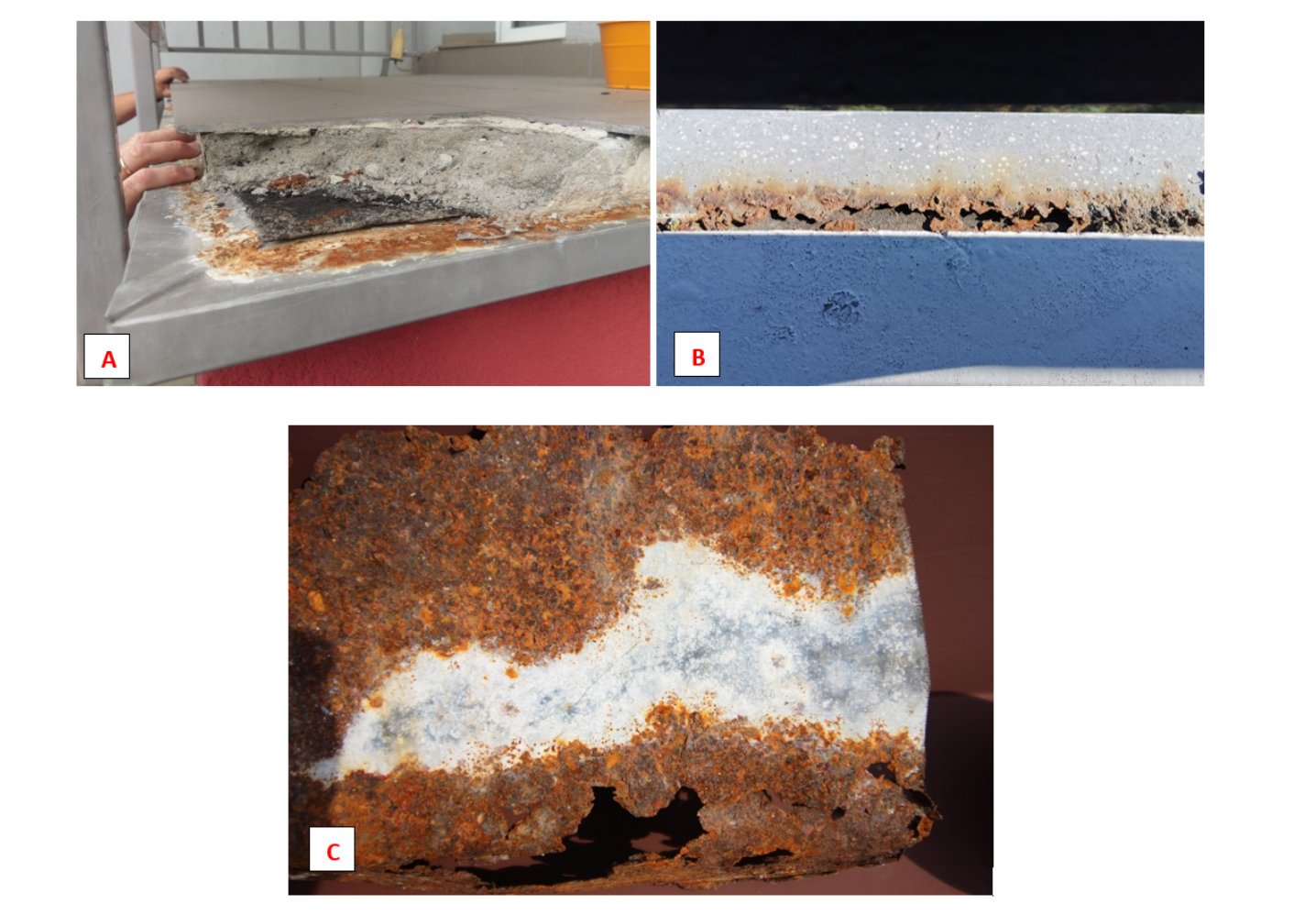 (C) korozja stali ocynkowanej (szary odcień – warstwa ochronna cynku, biało-szary zasadowy węglan cynku, rdzawy kolor – korozja stali w miejscu gdzie cynku uległ utlenieniu i rozpuszczeniu