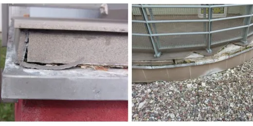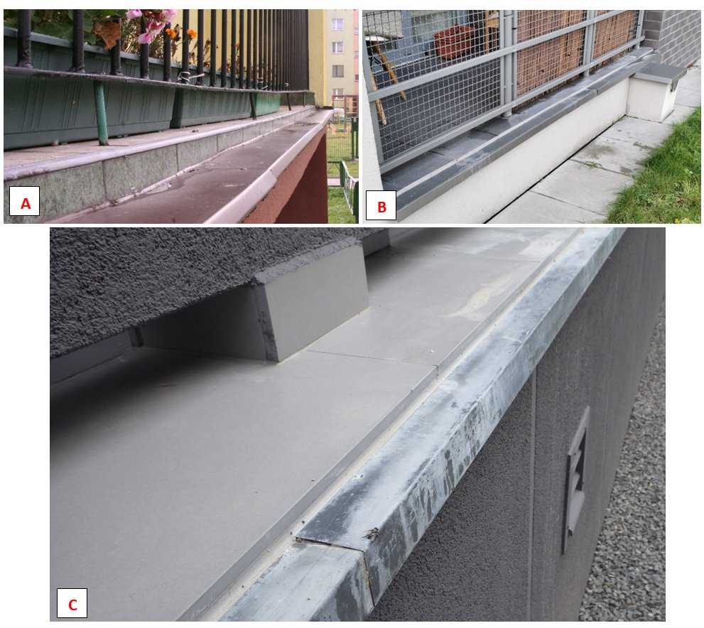 Taki układ był kompromisem pomiędzy właściwościami użytkowymi, dostępnymi materiałami, prostotą wykonania oraz, co najważniejsze, był relatywnie tani. Jego wadą jest jednak usytuowanie papy jako warstwy wodochronnej głęboko pod płytkami oraz warstwą dociskową. Powoduje to zawilgacanie cementowej wylewki dociskowej i w konsekwencji, po zaledwie kilku sezonach zimowych odpadanie płytek z czoła balkonu oraz przy krawędziach zewnętrznych. Towarzyszy temu często korozja samego opierzenia (Fot 3).