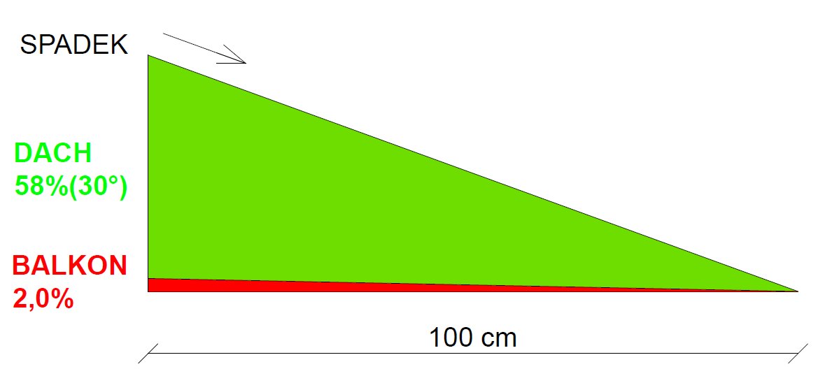 Na krawędzi okapowej tarasu lub balkonu mamy jednak do czynienia ze środowiskiem skrajnie agresywnym w porównaniu do tych jakie mogą występować np. na dachach. Użytkowy charakter powierzchni balkonowo-tarasowych nakazuje kształtowanie spadków na poziomie około 1,5-2,0%, podczas gdy dla typowego dachu są to wartość w zakresie 30°-45° czyli 58%-100% (Rys 5).