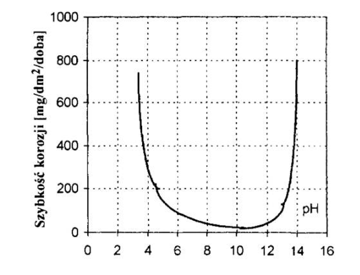 Z tego powodu, woda pozostaje dłużej na powierzchniach tarasowych i balkonowych. Przesączając się przez kapilary w fugach, zaprawach klejowych oraz wylewkach cementowych, wysyca się solami mineralnymi oraz alkaliami zwiększając odczyn do wartości pH nawet powyżej 13. Stężanie soli mineralnych oraz zasadowość mają charakter zmienny, w zależności od intensywności opadów, temperatury oraz przebiegu procesu karbonatyzacji zapraw cementowych. W takich warunkach blachy z ochroną powłokową nie są wystarczająco odporne na czynniki korozyjne. Cienkie powłoki lakiernicze o grubości o. 25 μm na blachach powlekanych zupełnie wystarczające w środowisku C3 (Tabela 1.) - atmosfera miejska, nie chronią przed wysoko nasyconymi roztworami alkaliów i soli. Natomiast warstwa pasywacyjna oraz cynk w wysoko alkalicznym środowisku są wypłukiwane ulegając reakcji utleniania i rozpuszczeniu. Analizując zależność szybkości korozji cynku od pH przedstawioną na Wykresie 1 widzimy, iż tempo jego korozji jest niewielkie w środowisku, gdzie pH przyjmuje wartość pomiędzy 6 a 12. Natomiast poza tym zakresem, szczególnie w silnie zasadowym środowisku, które występuje w wilgotnych zaprawach cementowych, klejach czy szlamach, przyrost szybkości korozji cynku jest bardzo gwałtowny.