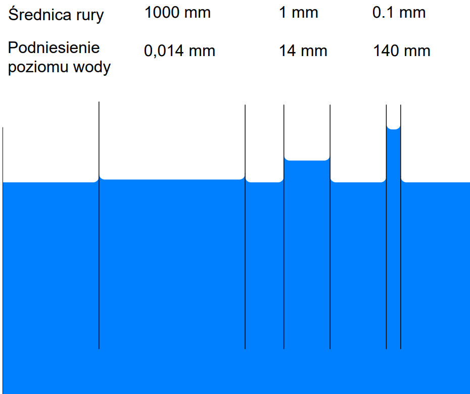 Zjawisko to jest niemal niezauważalne, gdy średnice kanałów są rzędu metrów czy centymetrów, jednak już milimetry lub jego części dziesiąte czy setne mogą powodować, iż woda będzie podciągana na wysokość nawet kilku metrów! Na rys. 1 przedstawiono wizualizacje zjawiska podciągania kapilarnego zachodzącego w szklanej rurce o średnicy odpowiednio f1 m, gdzie poziom wody podnosi się zaledwie o 0,014 mm, natomiast przy średnicy f1 mm poziom ten rośnie do 14 mm, a przy średnicy rurki spada do f0,1 mm woda podciągnięta zostaje na wysokość aż 140 mm.