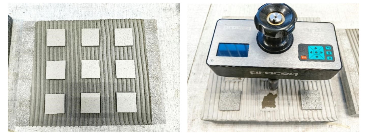 Podobnie jest w przypadku klejów cementowych objętych normą PN-EN ISO 12004, gdzie przyczepności po cyklach zamrażania i rozmrażania badane są na niewielkich wymiarowo próbkach wyciętych z płyt, które klejone są w taki sposób do podłoża, iż w trakcie badania nie oddziałują ze sobą fot. 7. Czy w wystarczającym stopniu odwzorowują warunki zewnętrzne? Czytelnik musi sobie sam odpowiedzieć na to pytanie.