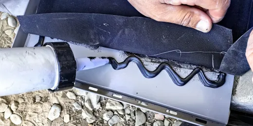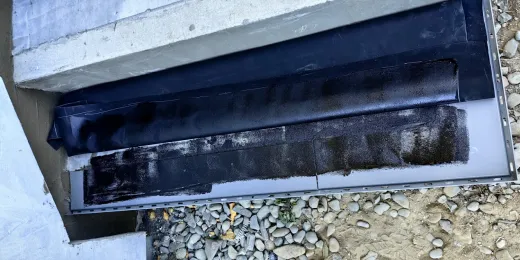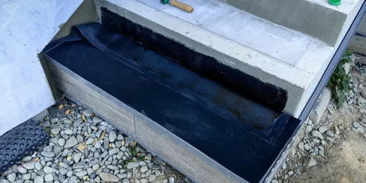 Po odmierzeniu wymiarów pierwszej podstopnicy, docięto pasmo folii EPDM Hertalan EASYCOVER, następnie na podłoże oraz na membranę EPDM naniesiono klej dwustronny Hertalan KS137 i po odczekaniu około 15 minut, membranę przyłożono w docelowym miejscu. Całą powierzchnię dociśnięto rolką silikonową, a krawędzie zamknięto uszczelniaczem Hertalan KS96 fot. 16.