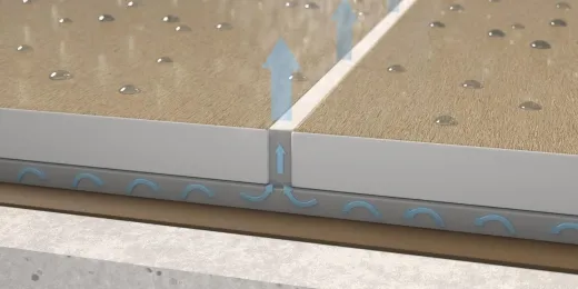 Podobne zjawisko zachodzi pod płytami ceramicznymi układanymi na zaprawie klejowej na warstwie hydroizolacji. Woda dostaje się pod okładzinę z płyt przez nieszczelności oraz przez fugi. Jest to zjawisko naturalne, ponieważ z założenia żadna fuga cementowa nie będzie wodoszczelna. Fuga umożliwia jednak odparowanie wilgoci spod okładziny jak na rys. 4, jeśli ma odpowiednio dobraną szerokość do wymiaru płyt. W praktyce jednak szerokość fugi, a przez to jej efektywna powierzchnia jest niewspółmiernie mała w porównaniu z powierzchnią przyklejonych płyt, co skutecznie ogranicza możliwość odprowadzania wilgoci.