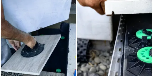- okładzina z płyt gresowych o grubości 2,0 cm układana jest bezklejowo, dzięki temu posadzka nie jest trwale związana z podłożem