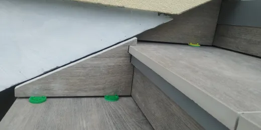 Możliwości wykończenia powierzchni schodów tarasowych jest wiele, jednak by uniknąć przykrych napraw i remontów poniżej opisujemy na przykładzie rzeczywistego przypadku jak wykonać schody wentylowane z płyt gresowych o grubości 20 mm układanych na wspornikach Renoplast SMART z profilami schodowymi Renoplast SW.