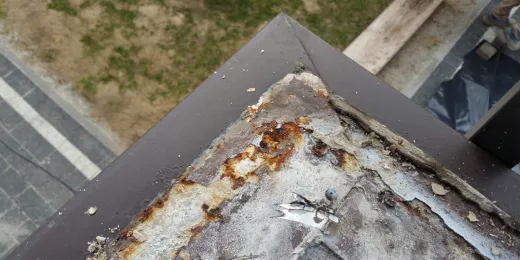 d) zastosowanie profili okapowych nieposiadających właściwej powłoki antykorozyjnej skutkuje ich szybką korozją, a w konsekwencji utratą szczelności wzdłuż okapu.