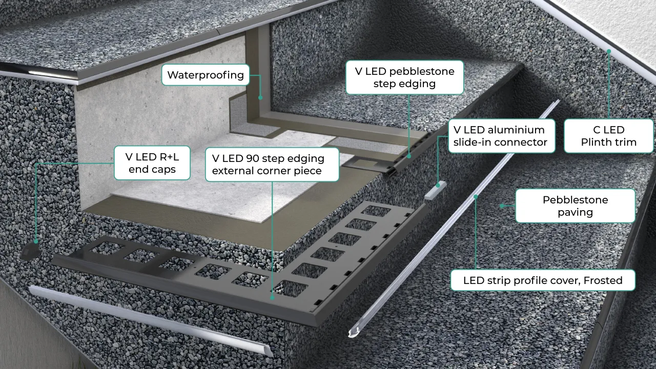 Neat finish and edge protection of stairs finished in pebblestone flooring with a system based on proprietary V LED step edgings.