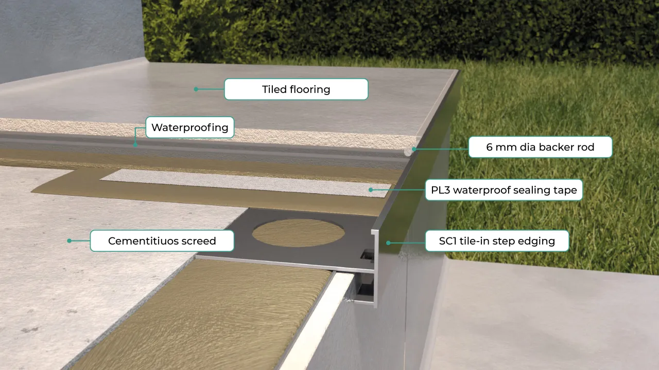 SC1 is a system designed for finishing outdoor stairs, based on SC1 tile-in step edgings inserted under tread tiles where the tread meets the rising.