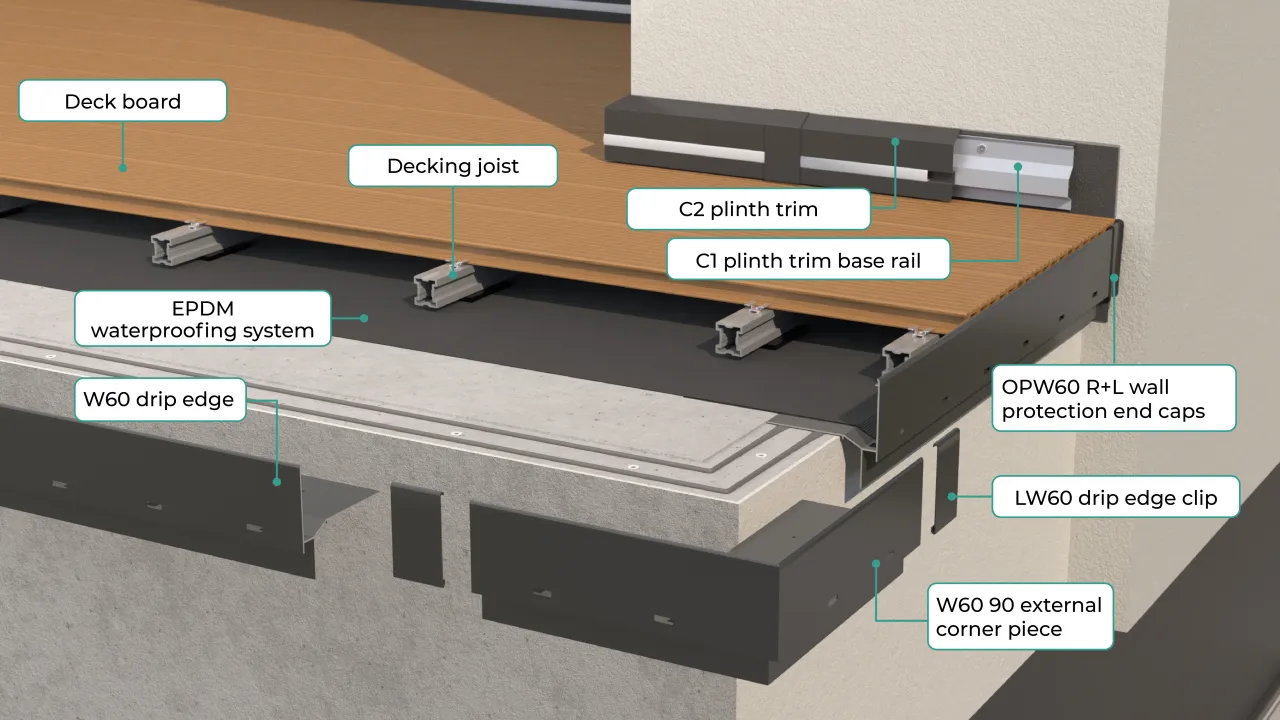 GRAND W60 DECK TILE SYSTEM is a trimming system from Renoplast, designed for terrace, patio and balcony areas surfaced with composite or wooden decking laid on aluminium joists.