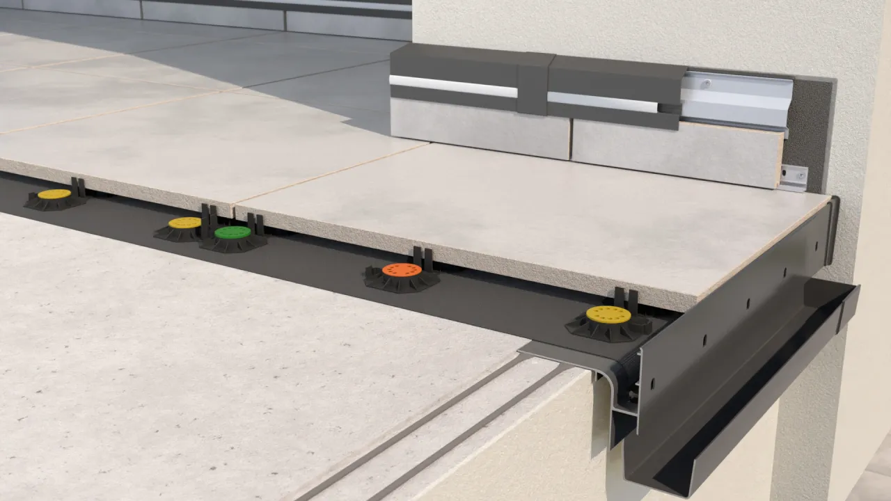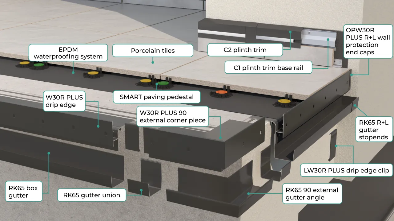 BASIC W30R PLUS trimming system is designed to be used on terraces, patios and balconies finished with 2 cm porcelain pavers laid on SMART fixed height or RENOPAD PRO 13-18 mm adjustable height pedestals.