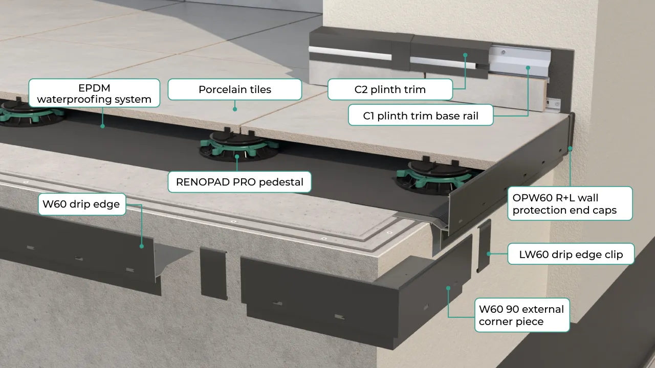 GRAND W60 trimming system is designed to be used on terraces, patios and balconies finished with 4-5 cm natural stone or concrete pavers laid on SMART fixed height pedestals or 2 cm porcelain pavers laid on RENOPAD PRO 29-47 mm adjustable height pedestals.