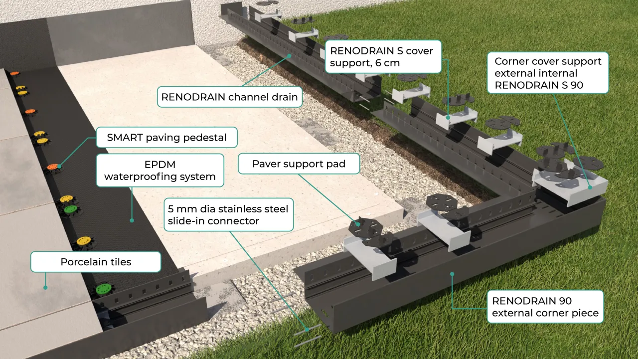 RENODRAIN channels ensure effective evacuation of rainwater runoff from patios installed on bases located below grade level.