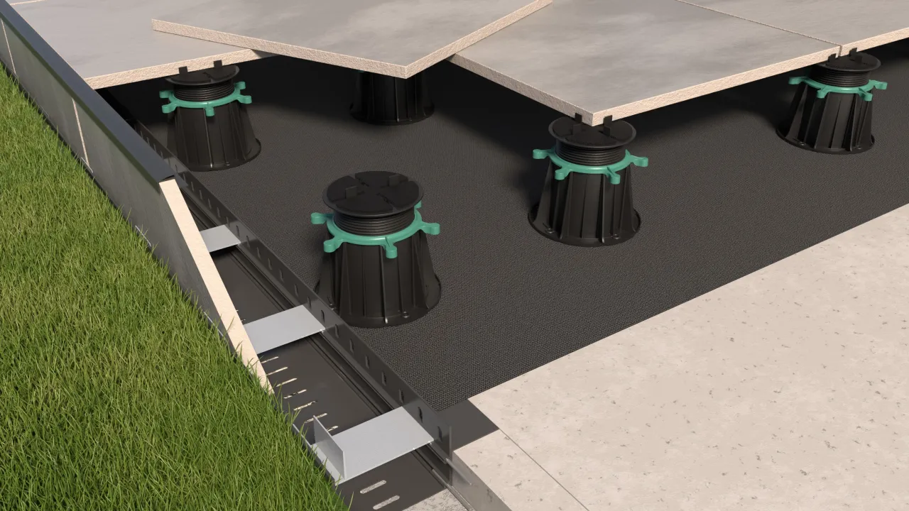 RENODRAIN XL System layers System elements System description RENODRAIN XL is a raised patio paving and drainage system comprising RENODRAIN channel drains and RENOPAD PRO adjustable height pedestals to support 2 cm porcelain pavers.