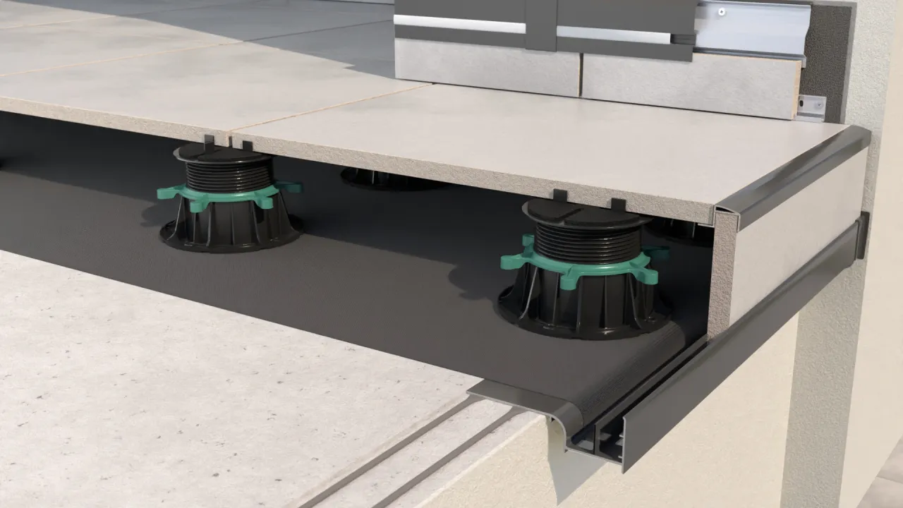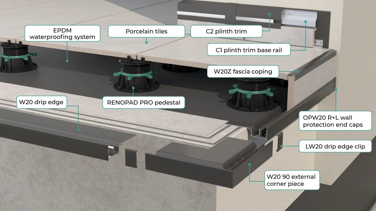 UNIWERSAL W20 is a trimming system designed to be used on terraces, patios and balconies finished with 2 cm porcelain pavers laid on RENOPAD PRO adjustable height pedestals.
