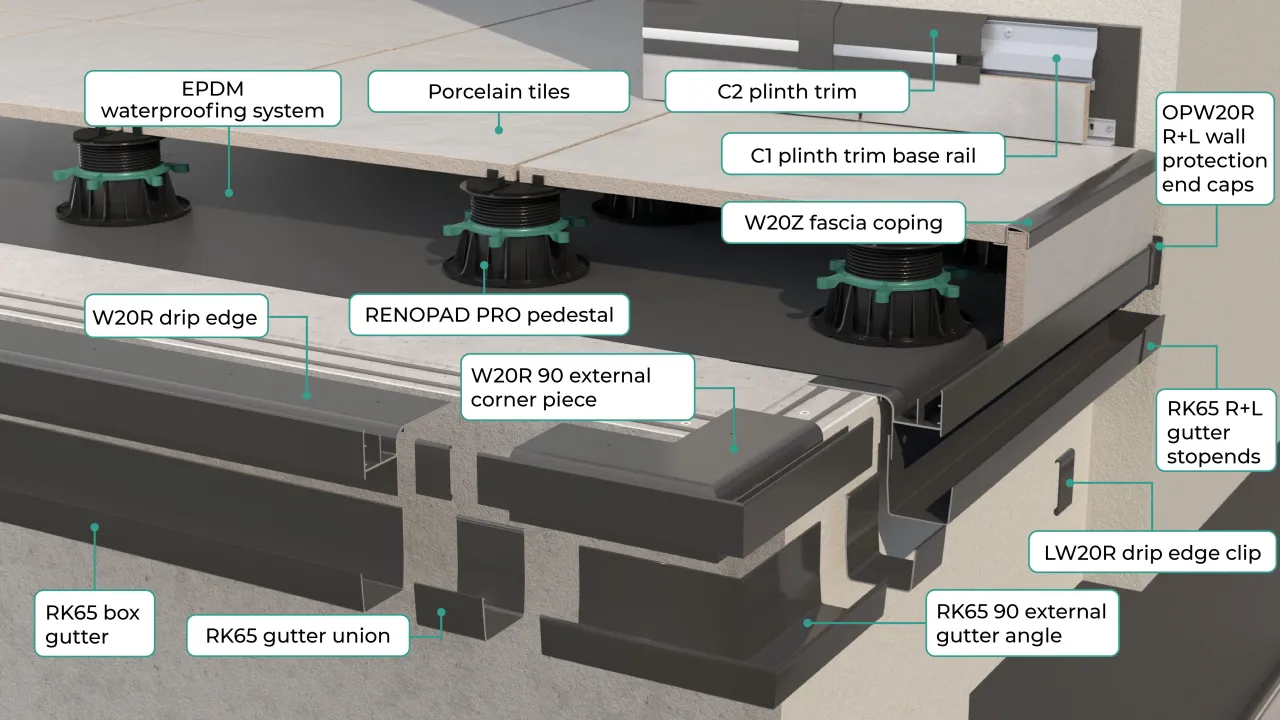 The W20R drip edge design allows finishing the fascias with the flooring pavers, cut to the required height and shape.