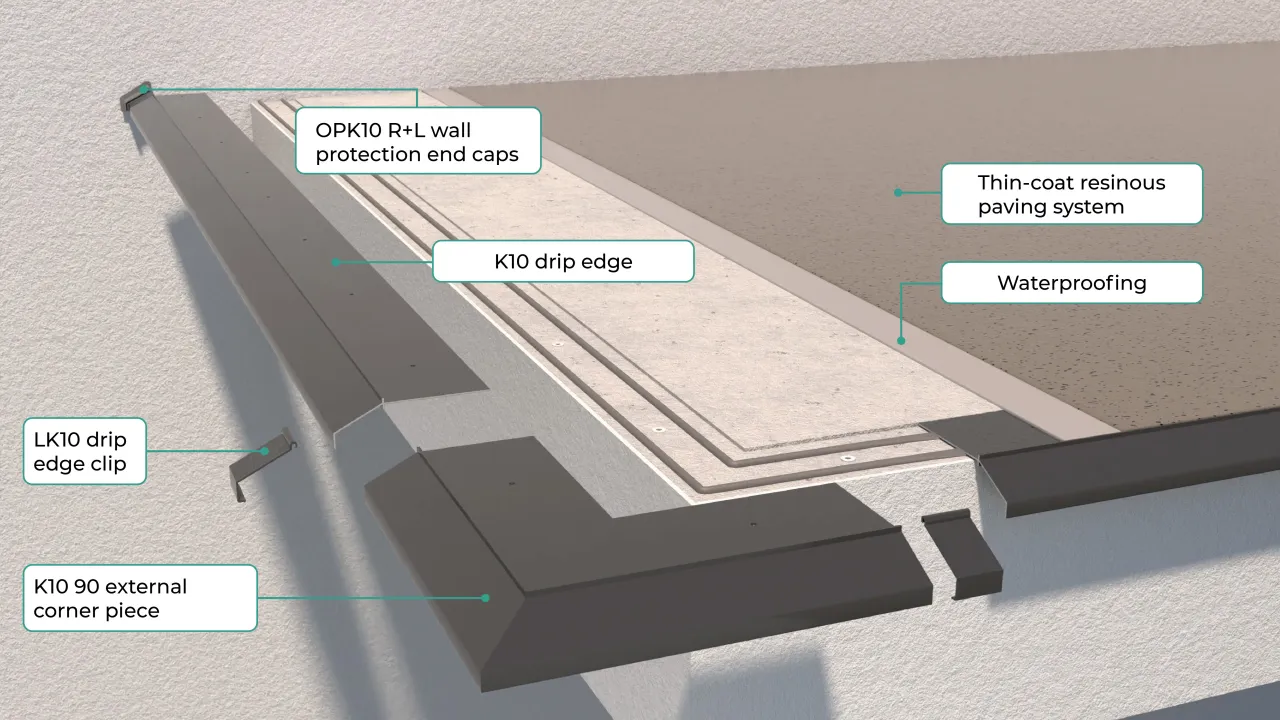 BASIC K10 is a trimming system from Renoplast, designed for terraces, patios and balconies finished with 2-3 mm thin-coat resinous outdoor flooring system.