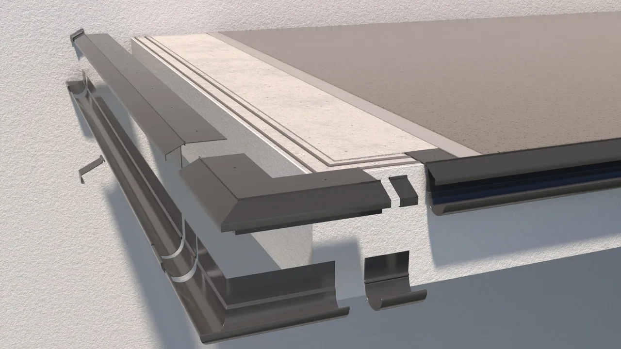 Easy attachment of fully compatible RENOPLAST R50 aluminium roof gutter system.
