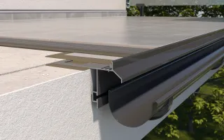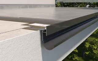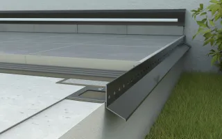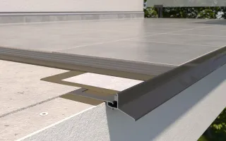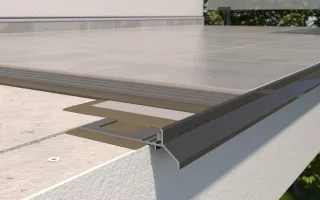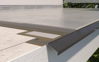 Our trimming solutions include drip edges for tiled flooring systems composed of porcelain floor tiles laid with tile adhesive on a sealing slurry layer.