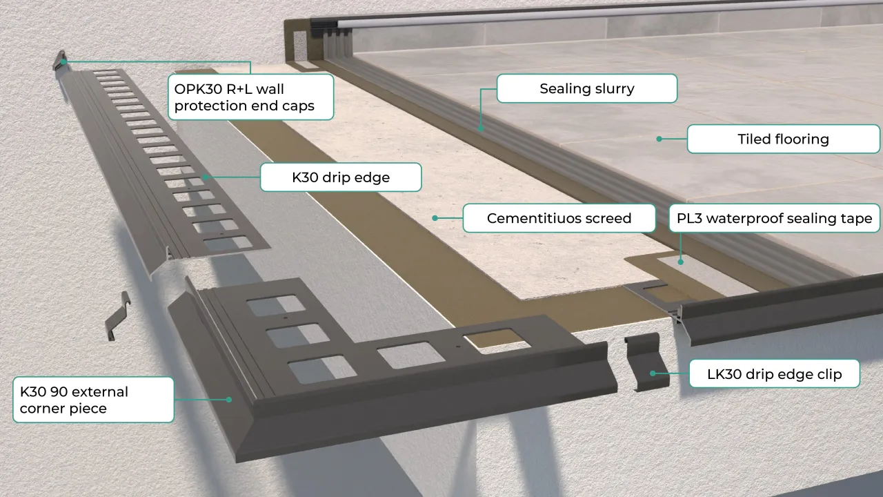 BASIC K30 is a trimming system from Renoplast, designed for terraces, patios and balconies sealed with sealing slurry and surfaced with porcelain tiles laid with tile adhesive.