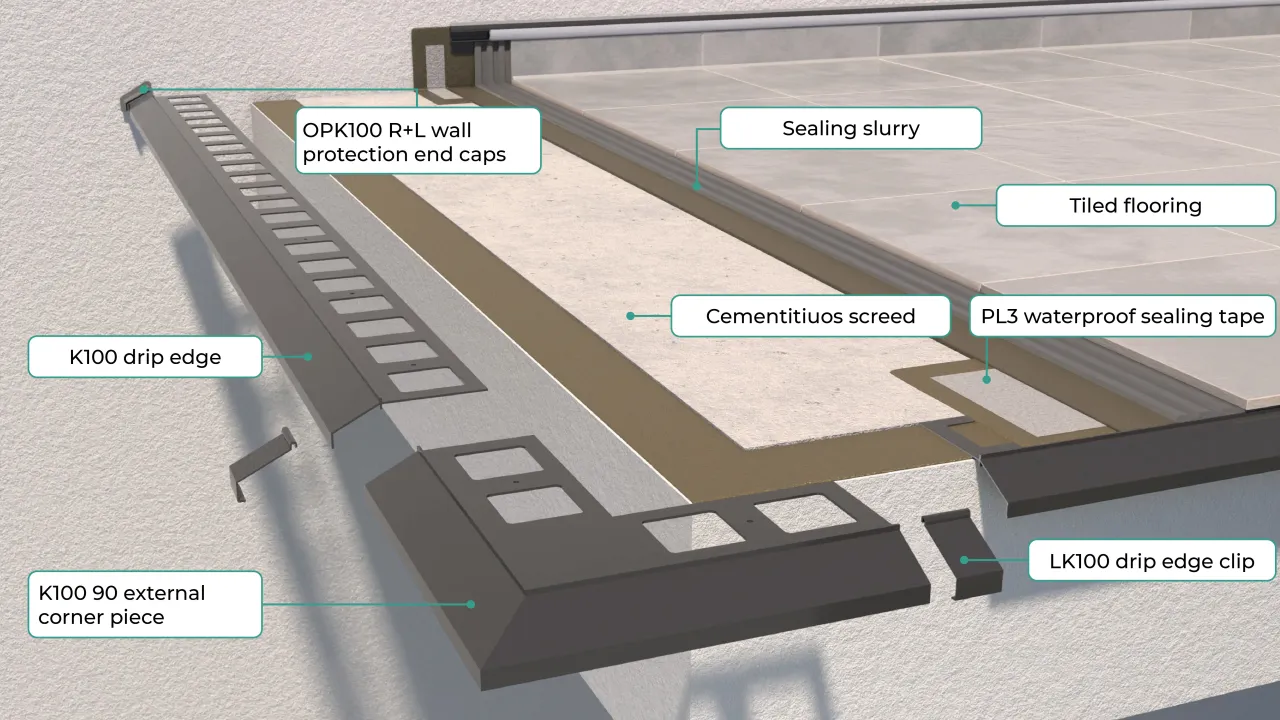 ECO K100 is a trimming system from Renoplast, designed for terraces, patios and balconies sealed with sealing slurry and surfaced with porcelain tiles laid with tile adhesive.