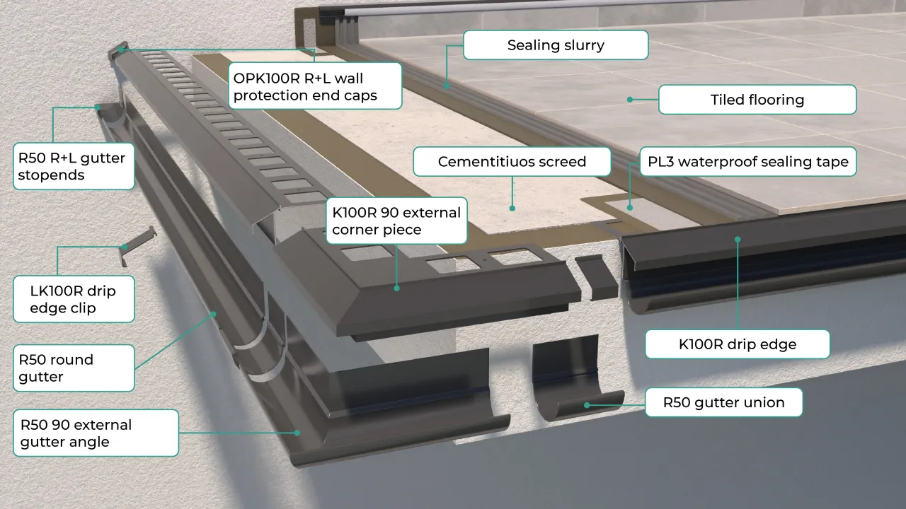 ECO K100R is a trimming system from Renoplast, designed for terraces, patios and balconies sealed with sealing slurry and surfaced with porcelain tiles laid with tile adhesive.