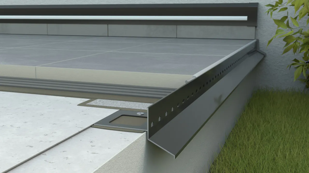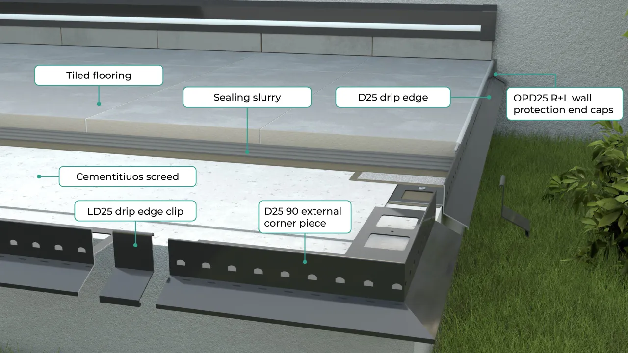 MULTI D25 is a trimming system from Renoplast, designed for terraces, patios and balconies sealed with sealing slurry and surfaced with 2 cm porcelain pavers laid with tile adhesive.