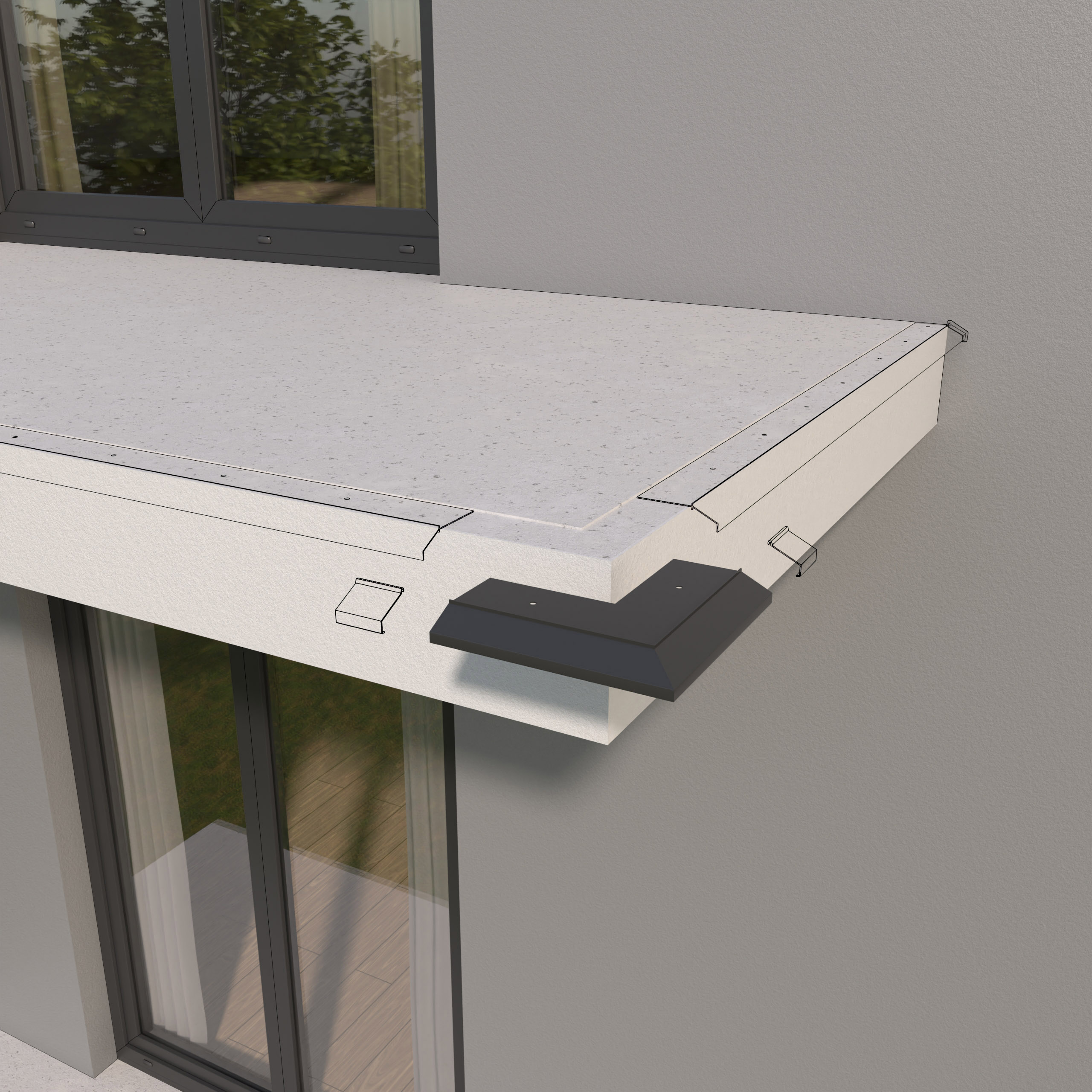 Narożnik zewnętrzny K10 90 jest elementem systemowego wykonania okapu profilami K10, który służy do wykończenia naroży zewnętrznych tarasu i balkonu o kącie 90 stopni.
