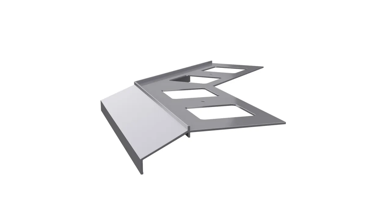 Narożnik zewnętrzny K100 135 jest elementem systemowego wykonania okapu profilami K100, który służy do wykończenia naroży zewnętrznych tarasu i balkonu o kącie 135 stopni.