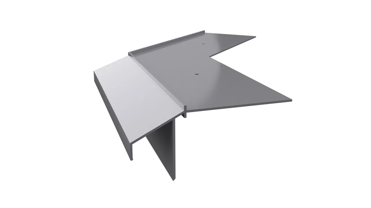 Narożnik zewnętrzny K10R 135 jest elementem systemowego wykonania okapu profilami K10R, który służy do wykończenia naroży zewnętrznych tarasu i balkonu o kącie 135 stopni.