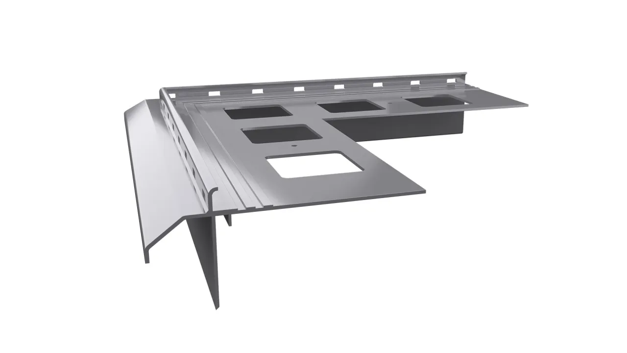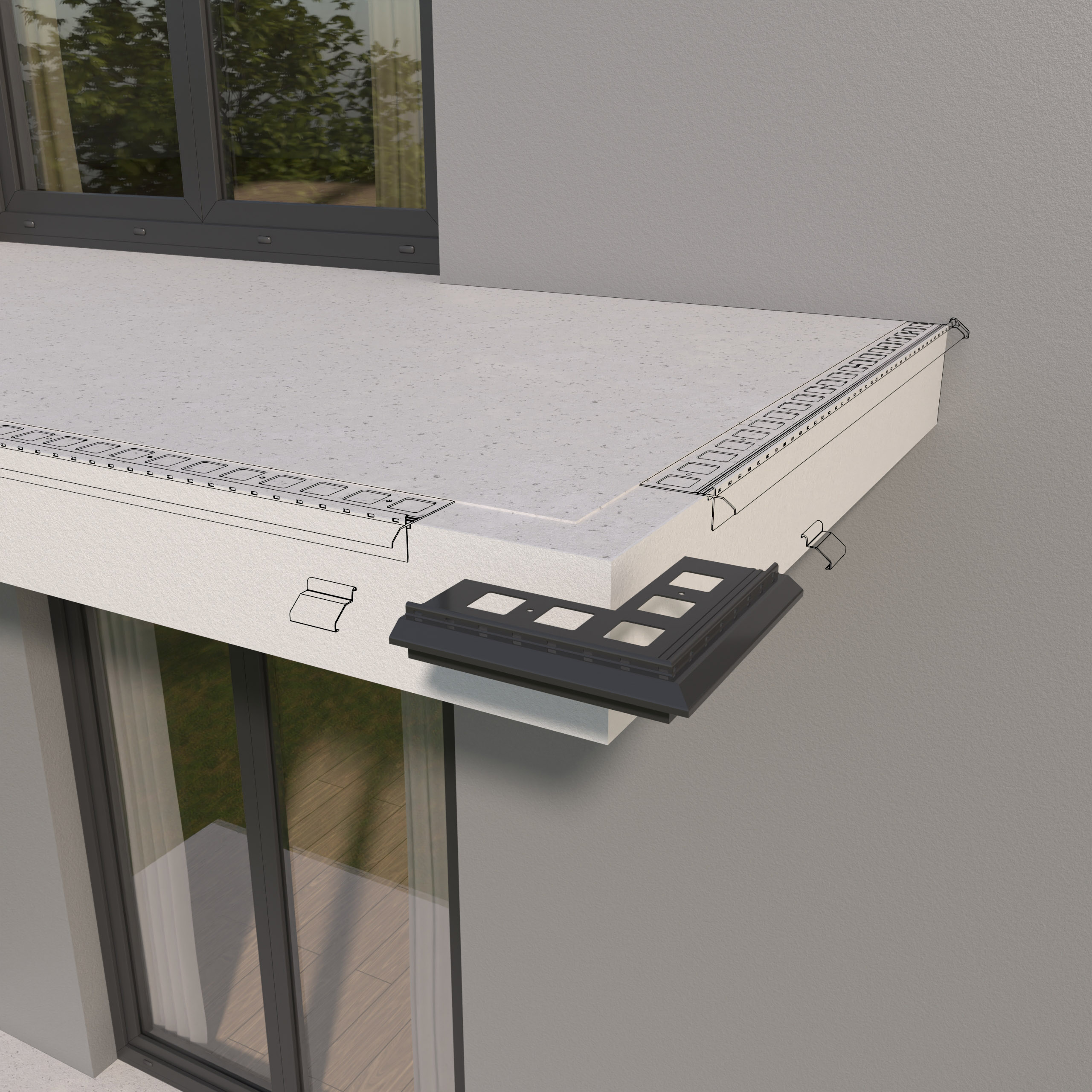 Narożnik zewnętrzny K20R 90 jest elementem systemowego wykonania okapu profilami K20R, który służy do wykończenia naroży zewnętrznych tarasu i balkonu o kącie 90 stopni.
