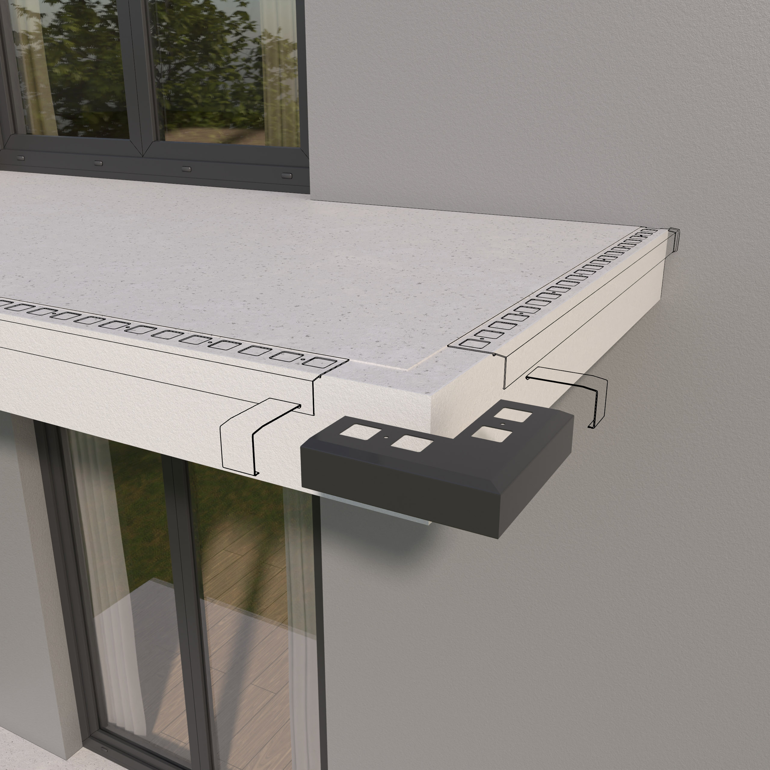 Narożnik zewnętrzny K301 90 jest elementem systemowego wykonania okapu profilami K301, który służy do wykończenia naroży zewnętrznych tarasu i balkonu o kącie 90 stopni.