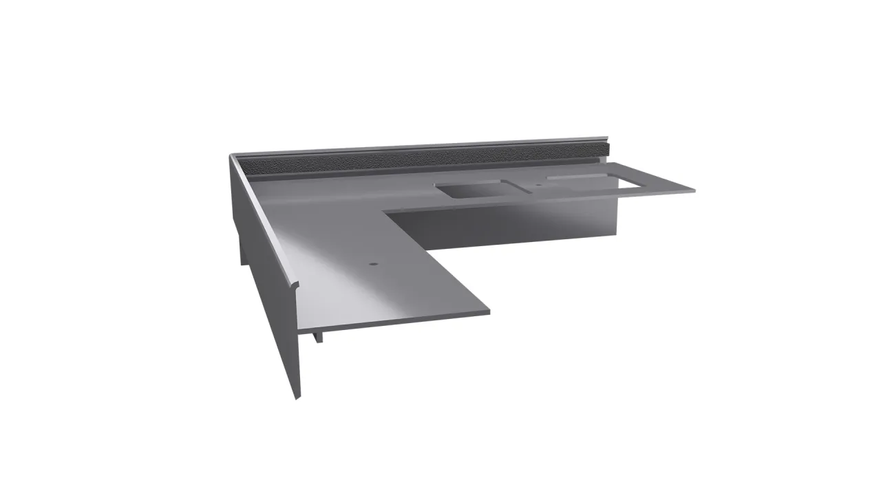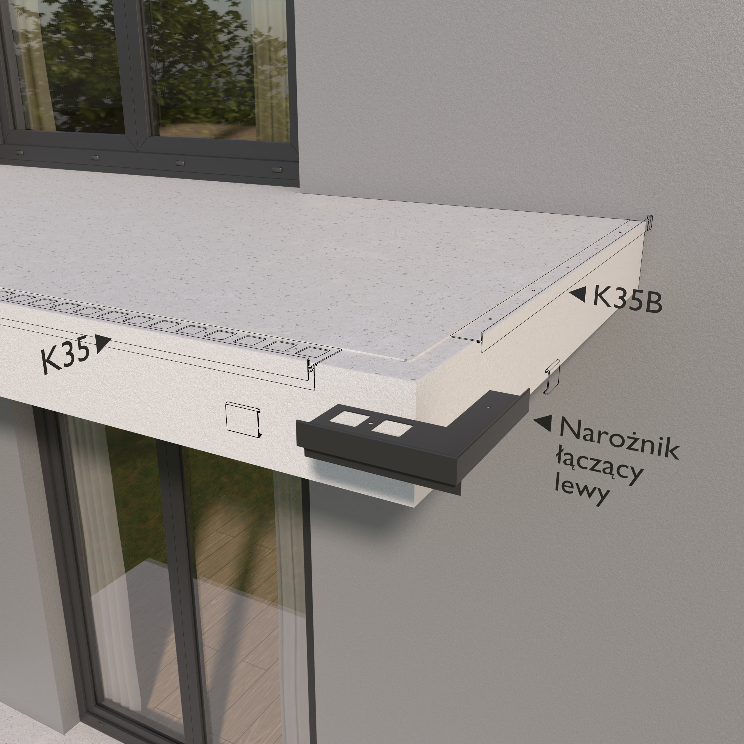 Narożnik zewnętrzny łączący K35/K35B 90 lewy jest elementem systemowego wykonania okapu profilami K35, który służy do wykończenia naroży tarasu i balkonu pod kątem 90 stopni, gdy stosowane są profile boczne K35B.