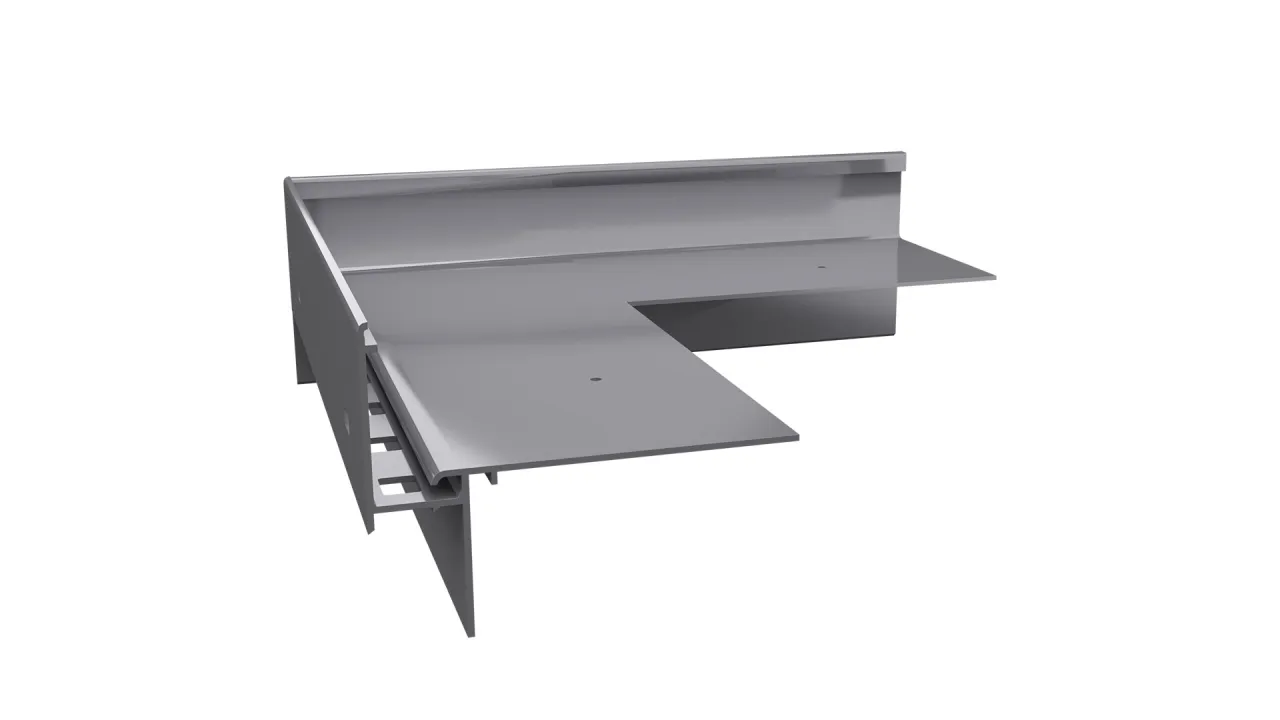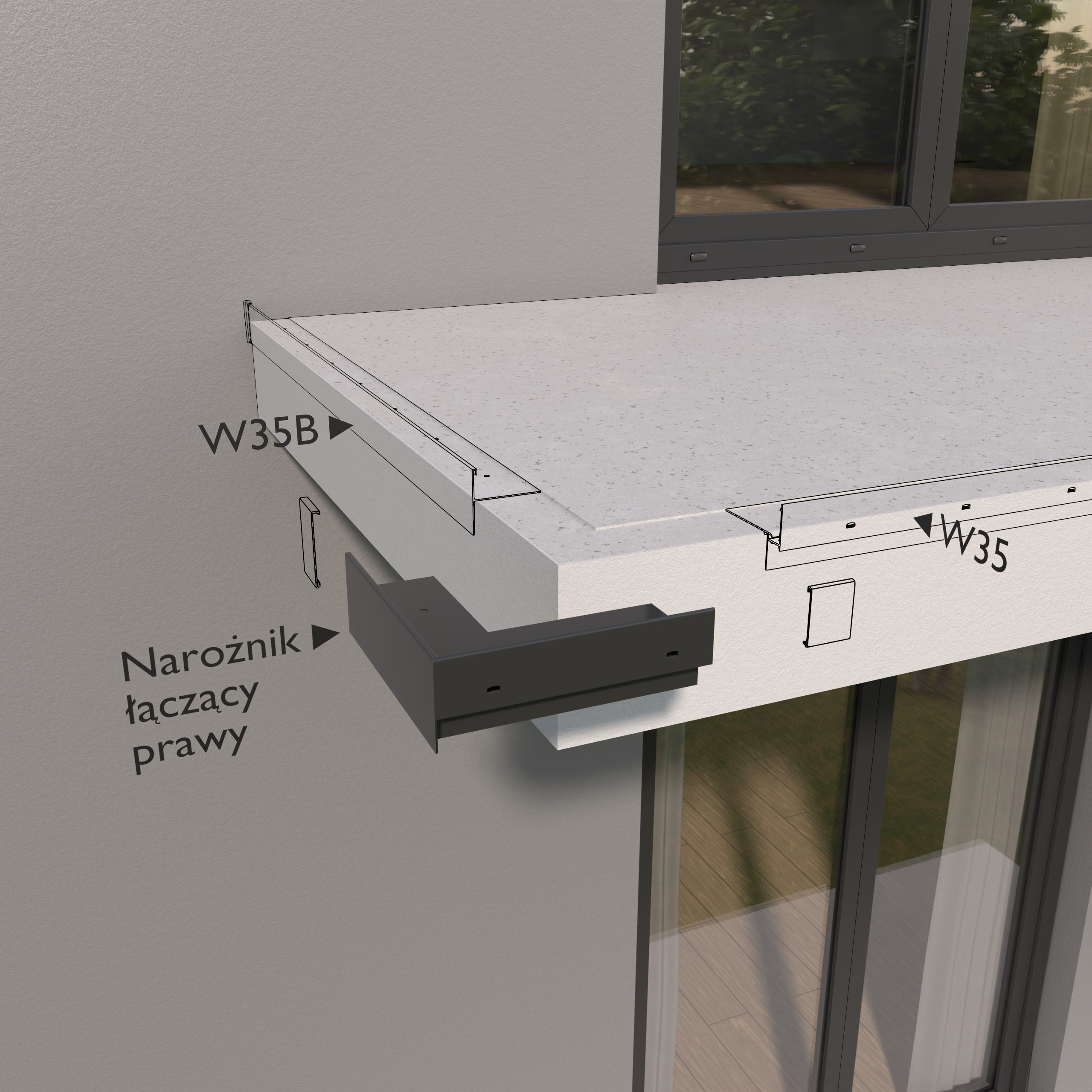 Narożnik zewnętrzny łączący W35 PLUS/W35B 90 Prawy jest elementem systemowego wykonania okapu profilami W35 PLUS, który służy do wykończenia naroży tarasu i balkonu pod kątem 90 stopni, gdy stosowane są profile boczne W35B.