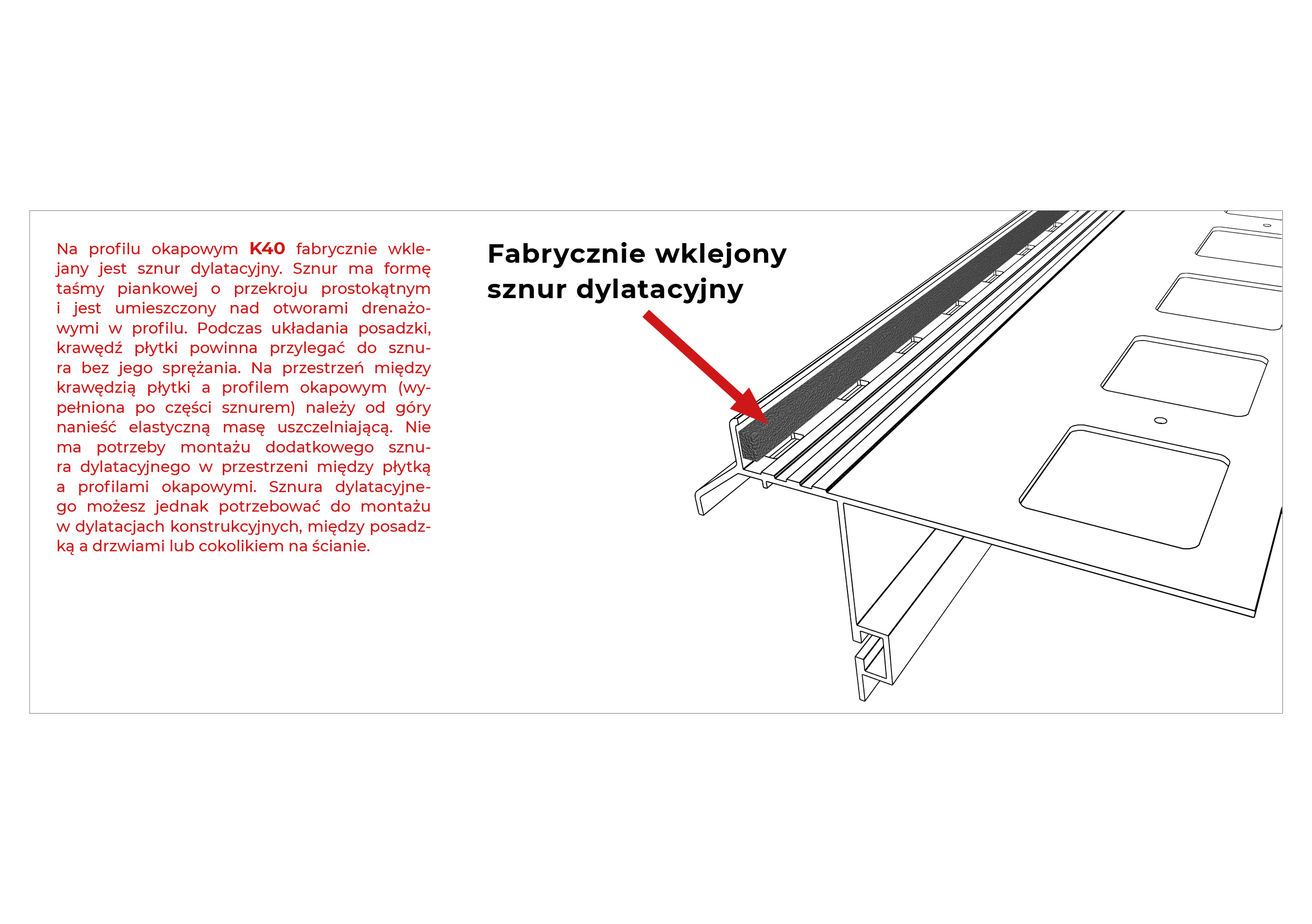 Profil okapowy K40 jest elementem systemu BASIC K40 do wykonania tarasów i balkonów z posadzką z płytek ceramicznych układanych na mineralnej zaprawie klejowej, z zastosowaniem hydroizolacji podpłytkowej z zaprawy uszczelniającej.