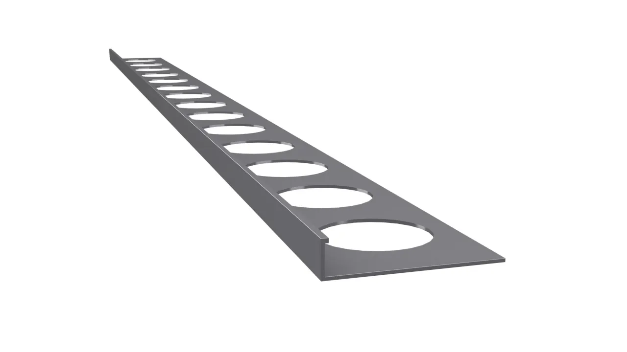 Profil schodowy SZ10 bez otworów odwadniających służy do wykończenia i wzmocnienia krawędzi schodów z okładziną wykonaną w technologii kamiennego dywanu na styku stopnicy i podstopnicy przy grubości okładziny 10 mm.