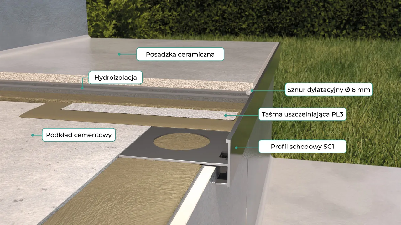 Profile schodowe SC1 umożliwiają wykończenie krawędzi schodów wykonywanych z okładziną z płyt ceramicznych, gresowych lub kamiennych układanych na zaprawie klejowej z hydroizolacją podpłytkową w postaci zaprawy uszczelniającej.