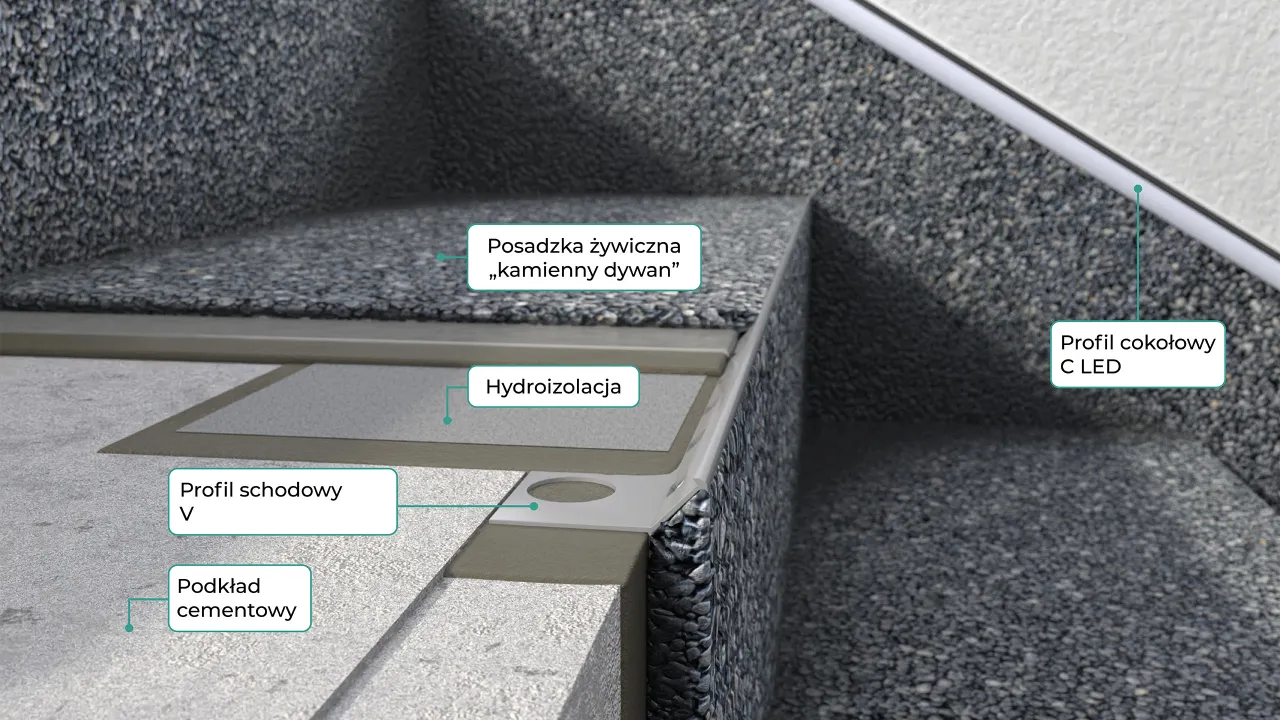 Zastosowanie profili schodowych V umożliwia wykończenie krawędzi schodów wykonywanych z okładziną żywiczną w technologii kamiennego dywanu w przypadku konieczności zapewnienia wysokiej wytrzymałości wykańczanych krawędzi z zachowaniem ich estetycznego wyglądu.