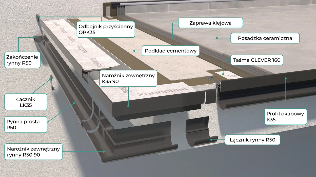 Najbardziej uniwersalny system do wykonania tarasów i balkonów z posadzką z płytek ceramicznych układanych na mineralnej zaprawie klejowej z uszczelnieniem podpłytkowym z zaprawy uszczelniającej. System charakteryzujący się zastosowaniem profili okapowych K35 których budowa zapewnia pełną szczelność pomiędzy profilem okapowym a posadzką z jednoczesnym odprowadzeniem wilgoci z warstw podposadzkowych. Konstrukcja profilu K35 umożliwia montaż aluminiowych rynien R50 z kolankami i rurami spustowymi. Ponadto profil K35 posiada szczelinę umożliwiającą zastosowanie taśmy uszczelniającej CLEVER oraz wklejony fabrycznie sznur dylatacyjny stanowiący podparcie dla uszczelnienia dylatacji pomiędzy profilem a posadzką oraz chroniący otwory odwadniające przed zasłonięciem zaprawą klejową w trakcie wykonywania prac. Profil K35 występuje w wersji umożliwiającej zastosowanie na balkonach i tarasach z krawędzią w kształcie luku. W skład systemu wchodzą profile okapowe K35 z elementami uzupełniającymi jak narożniki zewnętrzne i wewnętrzne K35 90 i K35 135 o kątach 90 i 135 stopni, łączniki LK35 i odbojniki przyścienne OPK35, taśma uszczelniajaca CLEVER, taśma progowa. Elementami opcjonalnymi są profile boczne K35B, narożnik zewnętrzny łączący K35/K35B 90º, łączniki LK35 oraz odbojniki przyścienne OPK35. Wykonanie tarasu lub balkonu w technologii klejonych płytek ceramicznych z wykończeniem strefy okapowej profilem K35 zapewnia skuteczne odprowadzenie wody opadowej z powierzchni posadzki, pełną szczelność konstrukcji, trwałość i odporność antykorozyjną profili, kompletność systemowego rozwiązania oraz estetyczny wygląd.