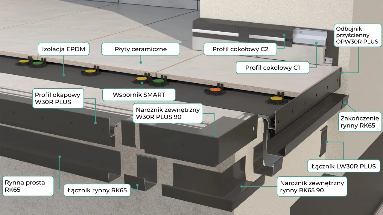 System do wykonania balkonów i tarasów z posadzką wentylowaną z płyt ceramicznych układanych na wspornikach tarasowych o stałej wysokości SMART lub wspornikach regulowanych RENOPAD PRO 13-18 mm równolegle do warstwy podkładu (ze spadkiem) z możliwością zamontowania systemowej aluminiowej rynny R50 lub RK65. W skład systemu BASIC W30 PLUS wchodzą profile okapowe W30 PLUS z elementami uzupełniającymi jak narożniki zewnętrzne i wewnętrzne W30R PLUS 90 i W30R 135 Plus o kątach 90 i 135 stopni, łączniki LW30R PLUS i odbojniki przyścienne OPW30R, rynny aluminiowe R50 lub RK65 z kolankami i rurą spustową, wsporniki do płyt posadzkowych SMART lub RENOPAD PRO 13-18 mm, membrana EPDM z narożnikam wewnętrznymi i zewnętrznymi, klejem i uszczelniaczem, taśmą samoprzylepną. Istotne cechy systemu to kompletność umożliwiająca wykonanie posadzki tarasu i balkonu bez konieczności dorabiania dodatkowych elementów. Unikalna budowa profili okapowych W30R PLUS dzięki umieszczonym od czoła profilu otworom odwadniającym umożliwia skuteczne odwodnienie powierzchni tarasu lub balkonu, również w warunkach niedrożności głównych otworów odwadniających. Sztywna budowa profili okapowych W30R PLUS zapewnia pewne oparcie dla posadzki z płyt ceramicznych uniemożliwiając ich przesuwanie, do jakiego dochodzi w okresie zimowym. Wsporniki SMART to stabilne i trwałe podparcie dla płyt posadzkowych z możliwością niwelacji nierówności podłoża za pomocą nakładek dystansowych. Opcjonalnie można stosować wspornik regulowany RENOPAD PRO 13-18 mm. Izolację z membrany EPDM cechuje wysoka trwałość oraz odporność na oddziaływanie czynników atmosferycznych i chemicznych. Prostota systemu BASIC W30 PLUS umożliwia wykonanie prac montażowych przez osoby nieposiadające specjalistycznej wiedzy technicznej.