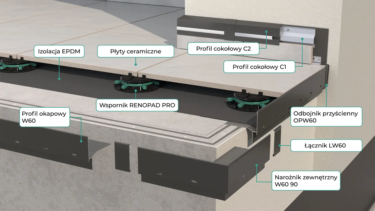 System do wykonania balkonów i tarasów z posadzką wentylowaną z płyt kamiennych, betonowych o grubości 4 - 5 cm układanych na wspornikach tarasowych o stałej wysokości SMART równolegle do warstwy podkładu lub płyt ceramicznych o gubości 2 cm układanych na wspornikach RENOPAD PRO 29-47 mm. Profil W60 umożliwia opcjonalny montaż systemowej aluminiowej rynny R50 lub RK65. W skład systemu GRAND W60 wchodzą profile okapowe W60 z elementami uzupełniającymi jak narożniki zewnętrzne i wewnętrzne W60 90 i W60 135 o kątach 90 i 135 stopni, łącznik LW30/LW30R PLUS/LW60 i odbojniki przyścienne OPW30/OPW30R PLUS/OPW60, rynny aluminiowe R50 lub RK65 z kolankami i rurą spustową, wsporniki do płyt posadzkowych SMART lub RENOPAD PRO 29-47 mm, membrana EPDM z narożnikam RENOCORNER, klejem RENOSTICK RS10 i uszczelniaczem RENOSEALANT RS09, taśmą samoprzylepną RENOBAND BT. Istotne cechy systemu to kompletność umożliwiająca wykonanie posadzki tarasu i balkonu bez konieczności dorabiania dodatkowych elementów. Unikalna budowa profili dzięki umieszczonym od czoła profilu otworom przelewowym okapowych W60, umożliwia skuteczne odwodnienie powierzchni tarasu czy balkonu, również w warunkach niedrożności otworów drenażowych. Sztywna budowa profili okapowych W60 zapewnia stabilne oparcie dla posadzki z płyt posadzkowych uniemożliwiając ich przesuwanie, do jakiego dochodzi w okresie zimowym. Wsporniki SMART to trwałe podparcie dla ciężkich płyt posadzkowych z możliwością niwelacji nierównści podłoża za pomocą nakładek dystansowych. Opcjonalnie, można stosować wspornik regulowany RENOPAD PRO 29-47 mm. Izolację z membrany EPDM cechuje wysoka trwałość oraz odporność na oddziaływanie czynników atmosferycznych i chemicznych. Prostota systemu GRAND W60 umożliwia wykonanie prac montażowych przez osoby nieposiadające specjalistycznej wiedzy technicznej.