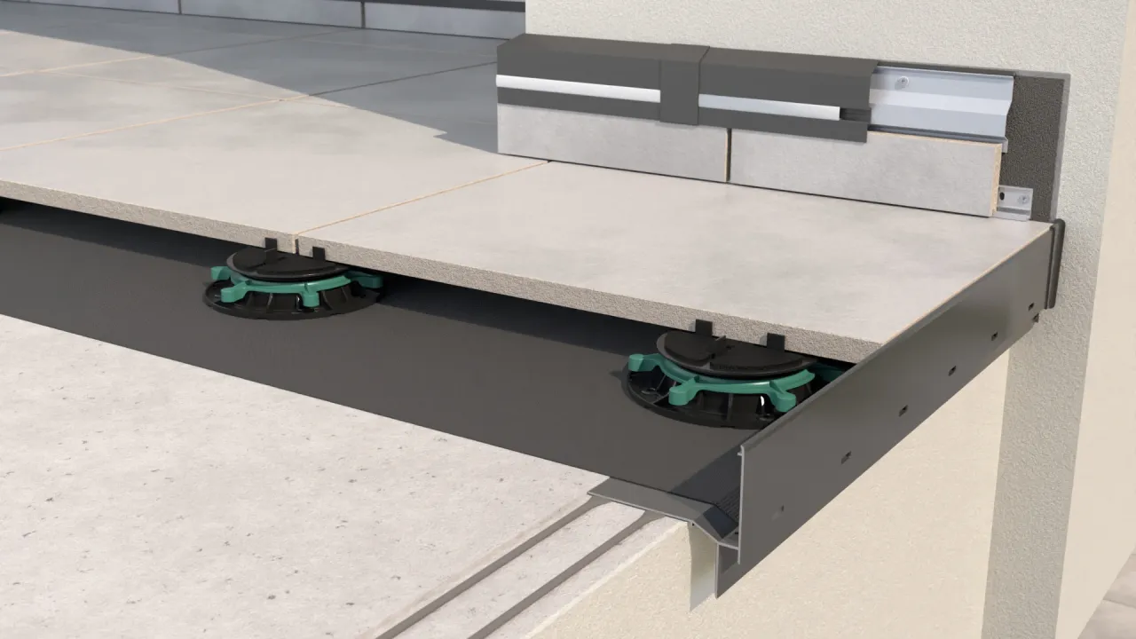 System do wykonania tarasów i balkonów z posadzką wentylowaną z płyt kamiennych lub betonowych o grubościach 4-5 cm na wspornikach nieregulowanych SMART lub płyt ceramicznych o grubości 2 cm na wspornikach regulowanych RENOPAD PRO 29-47 mm.