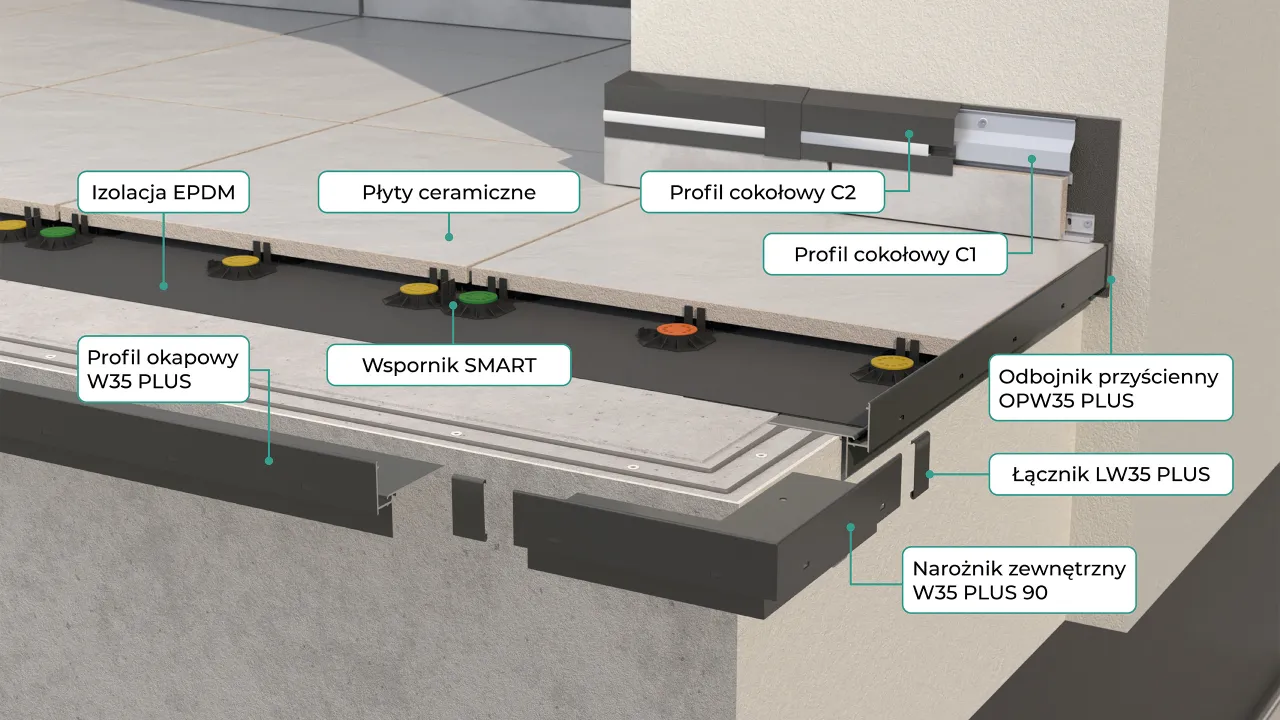 System do wykonania balkonów i tarasów z posadzką wentylowaną z płyt ceramicznych układanych na wspornikach tarasowych SMART lub wspornikach regulowanych RENOPAD PRO 13-18 mm równolegle do warstwy podkładu (ze spadkiem). Profil W35 PLUS umożliwia opcjonalny montażu systemowej aluminiowej rynny R50 lub RK65. Profil okapowy W35 PLUS umożliwia integrację z kołnierzem uszczelniającym EPDM. Dzięki fabrycznie przygotowanej odmianie profilu łukowego nacinanego W35 PLUS system umożliwia wykonanie tarasu czy balkonu z okapem w łuku. W skład systemu PRO W35 PLUS wchodzą profile okapowe W35 PLUS z elementami uzupełniającymi jak narożniki zewnętrzne i wewnętrzne W35 PLUS 90 i W35 PLUS 135 o kątach 90 i 135 stopni, łączniki LW35 PLUS i odbojniki przyścienne OPW35 PLUS, rynny aluminiowe R50 lub RK65 z kolankami i rurą spustową, wsporniki do płyt posadzkowych SMART lub RENOPAD PRO 13-18. Elementami opcjonalnymi są profile boczne W35B, narożnik zewnętrzny łączący W35 PLUS/W35B 90 stopni, łączniki LW35B oraz odbojniki przyścienne OPW35B. Hydroizolację stanowi membrana EPDM z narożnikami wewnętrznymi i zewnętrznymi, klejem i uszczelniaczem oraz taśmą samoprzylepną. Istotne cechy systemu to kompletność umożliwiająca wykonanie posadzki tarasu i balkonu bez konieczności dorabiania dodatkowych elementów. Dzięki unikalnej budowie profili okapowych W35 PLUS możliwe jest skuteczne odwodnienie tarasu i balkonu, a w przypadku zanieczyszczenia czy niedrożności otworów drenażowych, odwodnienie odbywa się poprzez dodatkowe otwory przelewowe. Sztywna budowa profili okapowych W35 PLUS zapewnia oparcie dla posadzki z płyt ceramicznych uniemożliwiając ich przesuwanie, do jakiego dochodzi w okresie zimowym. Wsporniki SMART to stabilne i trwałe oparcie dla płyt posadzkowych z możliwością niwelacji nierówności podłoża za pomocą nakładek dystansowych. Opcjonalnie można stosować wspornik regulowany RENOPAD PRO 13-18 mm. Izolację z membrany EPDM cechuje wysoka trwałość oraz odporność na oddziaływanie czynników atmosferycznych i chemicznych. Połączenie izolacji z membrany EPDM odbywa się za pośrednictwem zintegrowanego z profilem W35 PLUS kołnierza uszczelniającego EPDM. Prostota systemu PRO W35 PLUS umożliwia wykonanie prac montażowych przez osoby nieposiadające specjalistycznej wiedzy technicznej.